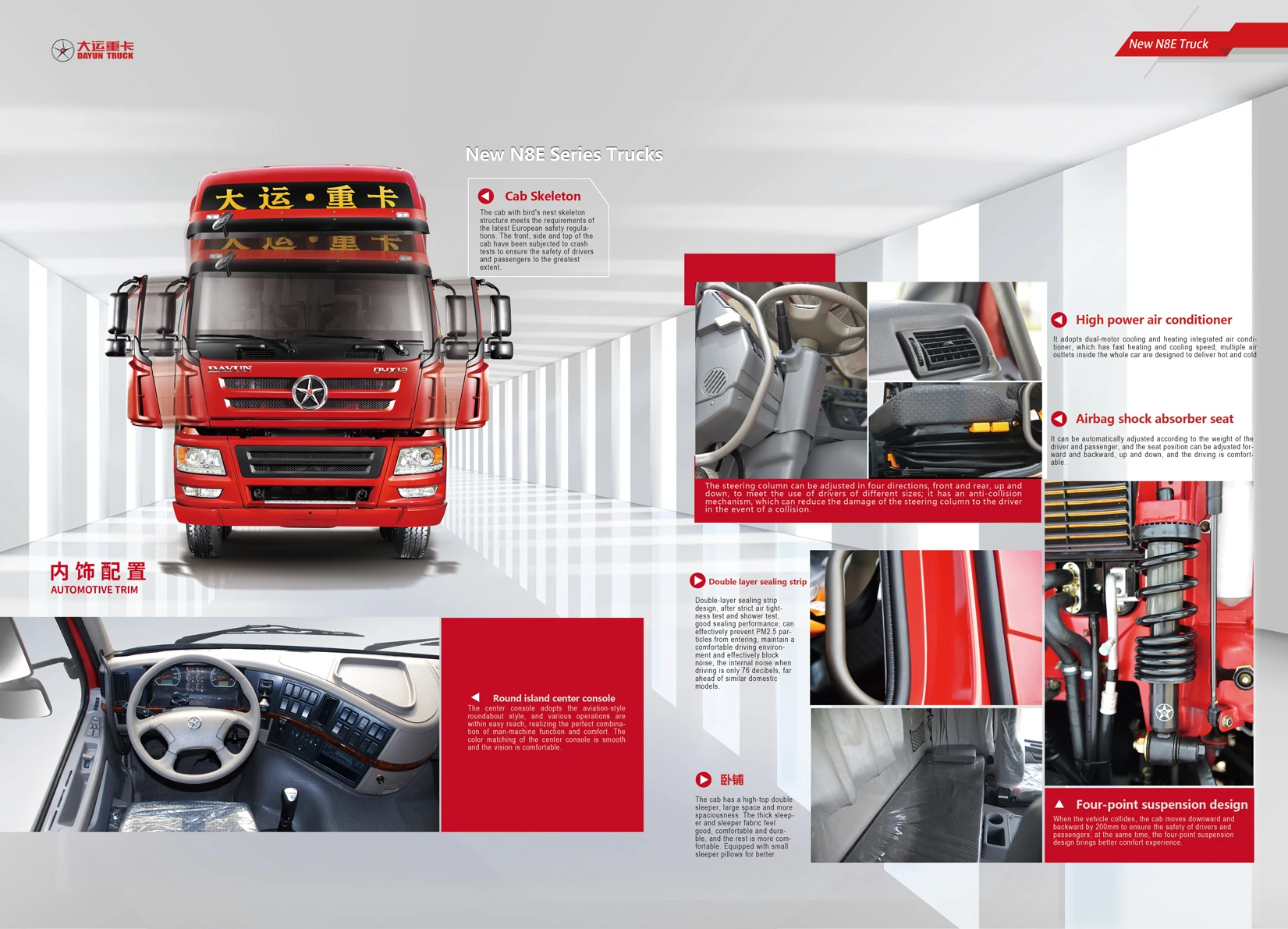 Quando o veículo colide, a cabine se move para baixo e para trás em 200 mm para garantir a segurança dos motoristas e passageiros; ao mesmo tempo, o design da suspensão de quatro pontos traz uma melhor experiência de conforto.